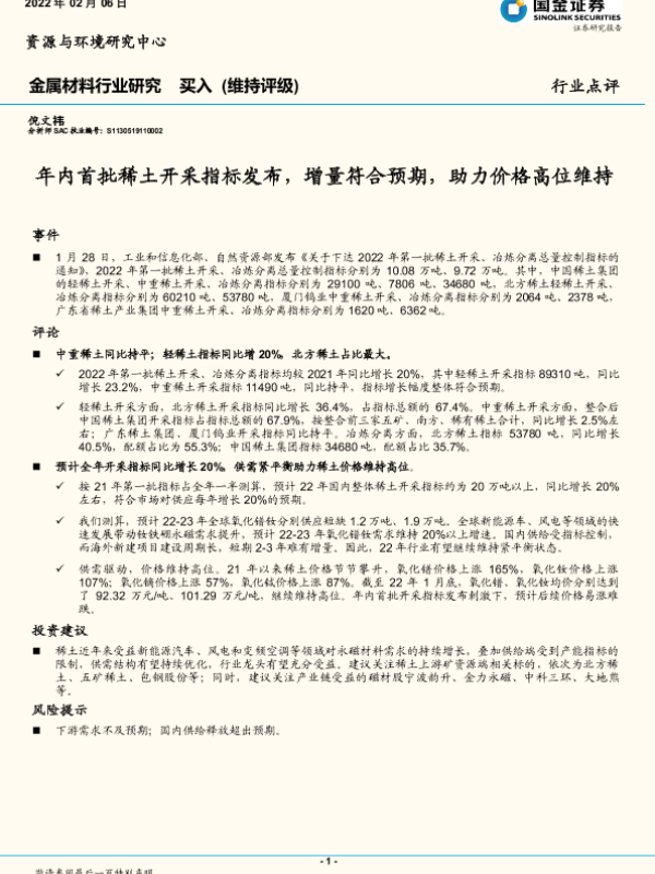 【国金证券】【20220206】20220206-国金证券-金属材料行业研究:年内首批稀土开采指标发布,增量符合预期,助力价格高位维持-3页 行业研究
