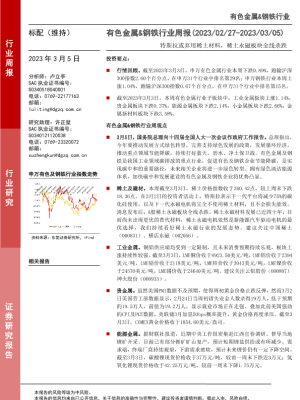 【东莞证券】【20230305】20230305-东莞证券-有色金属&钢铁行业周报:特斯拉或弃用稀土材料,稀土永磁板块全线杀跌-14页 行业研究