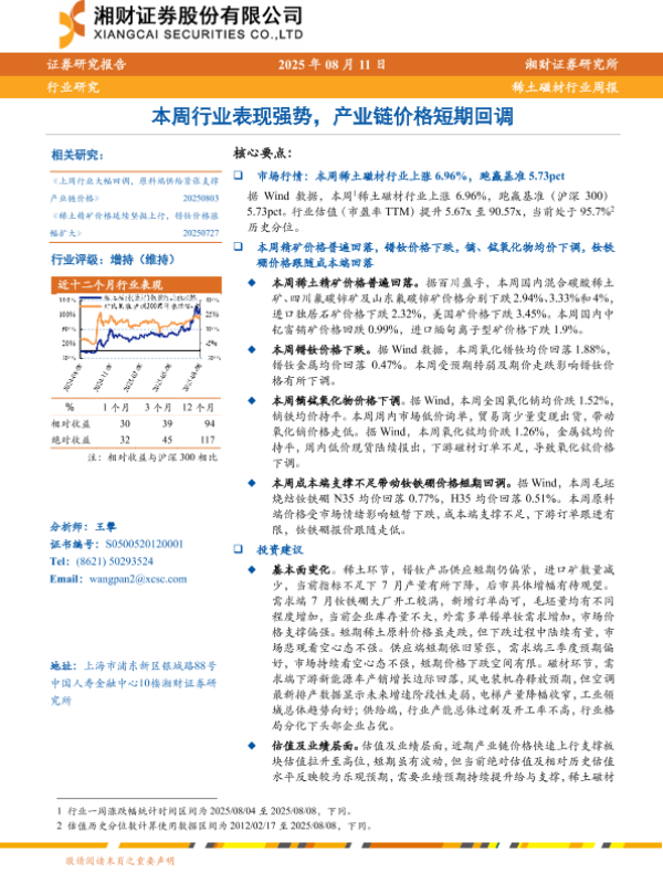 【湘财证券】【20250811】稀土磁材行业周报:本周行业表现强势,产业链价格短期回调-8页 行业研究