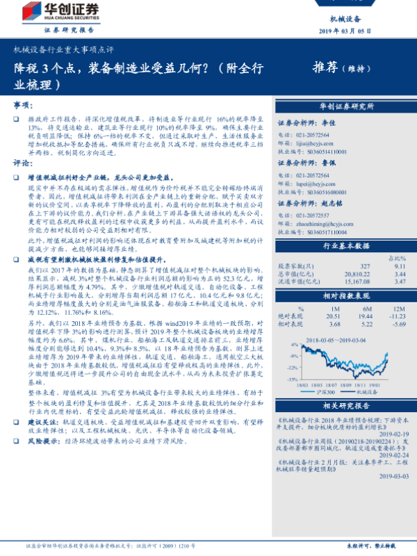 【华创证券】【20190305】机械设备行业重大事项点评:降税3个点,装备制造业受益几何?(附全行业梳理)-10页 行业研究