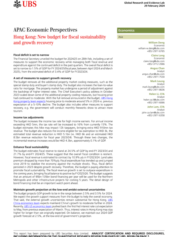 【UBS Securities Asia Limited】【20240229】香港2024/25财年新预算:财政可持续性与增长复苏-8页 行业研究