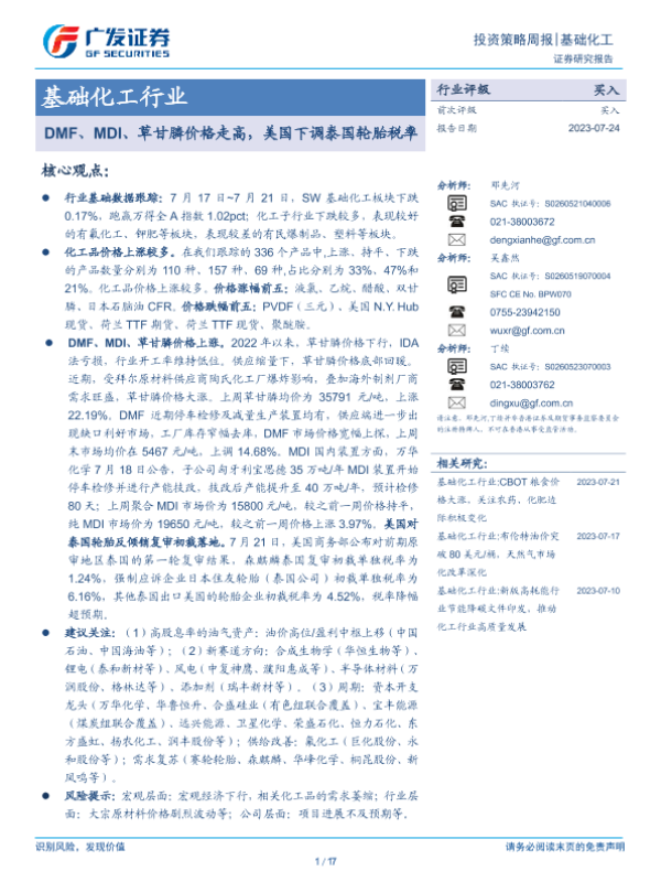 【广发证券】【20230724】20230724-广发证券-基础化工行业投资策略周报:DMF、MDI、草甘膦价格走高,美国下调泰国轮胎税率-17页 行业研究