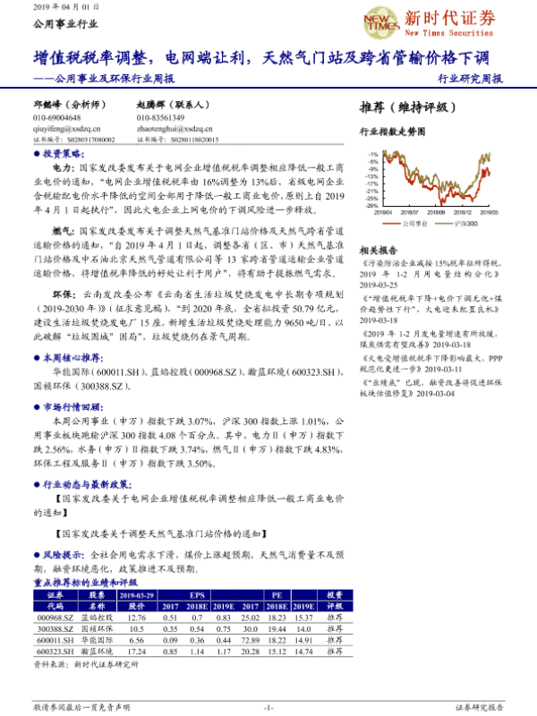 【新时代证券】【20190401】公用事业及环保行业周报:增值税税率调整,电网端让利,天然气门站及跨省管输价格下调-14页 行业研究
