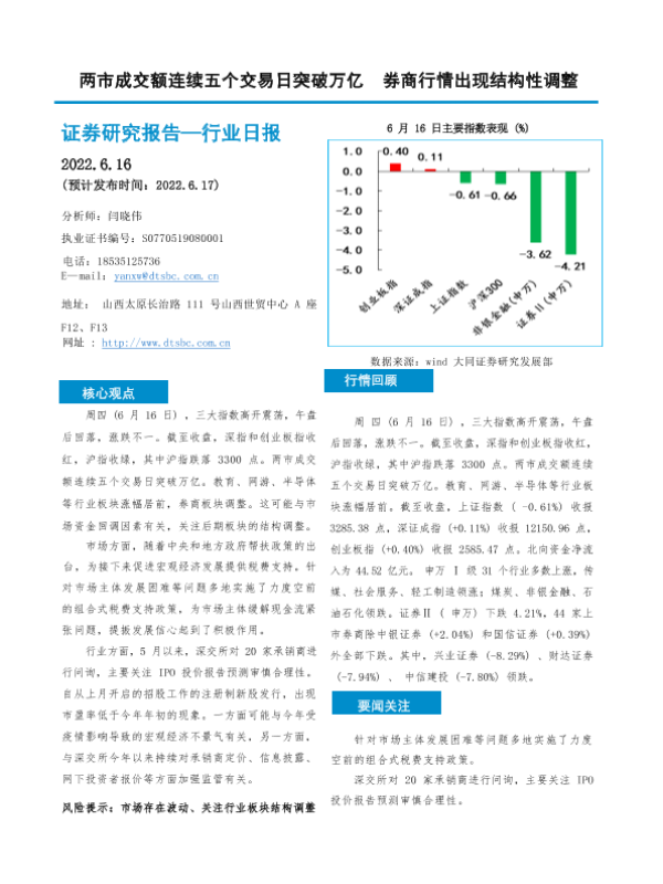 【大同证券】【20220616】两市成交额连续五个交易日突破万亿 券商行情出现结构性调整-10页 行业研究