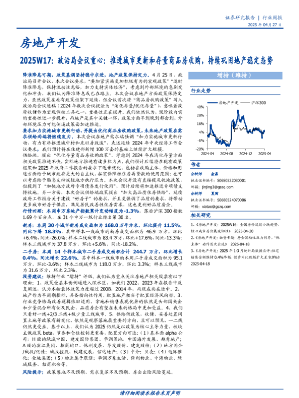 【国盛证券】【20250427】2025W17-政治局会议重心:推进城市更新和存量商品房收购,持续巩固地产稳定态势-16页 证券期货研究报告