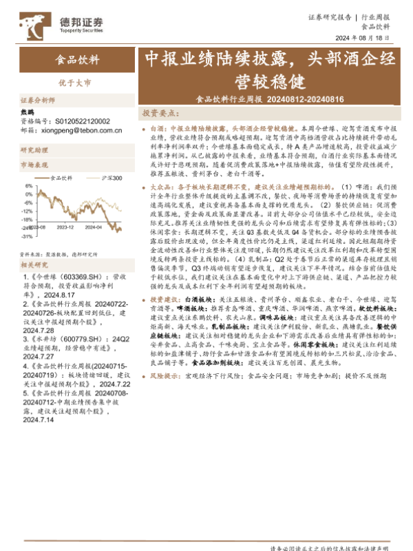 【德邦证券】【20240818】20240818-德邦证券-食品饮料行业周报:中报业绩陆续披露,头部酒企经营较稳健-16页 行业研究