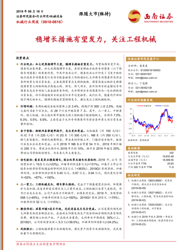 【西南证券】【20190616】机械行业周报:稳增长措施有望发力,关注工程机械-9页 行业研究