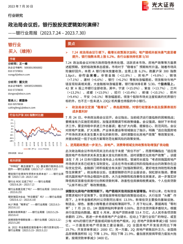 【光大证券】【20230730】银行业周报:政治局会议后,银行股投资逻辑如何演绎?-12页 行业研究