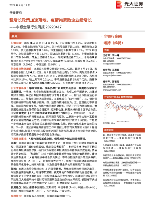 【光大证券】【20220417】非银金融行业周报:稳增长政策加速落地,疫情拖累险企业绩增长-8页 行业研究