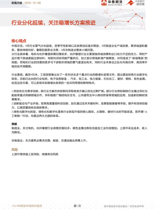 【华泰期货】【202510】宏观月报 | 行业分化延续,关注稳增长方案推进-10页 证券期货研究报告