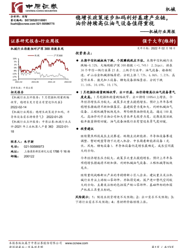 【中原证券】【20220216】机械行业周报:稳增长政策逐步加码利好基建产业链,油价持续高位油气设备值得重视-13页 行业研究