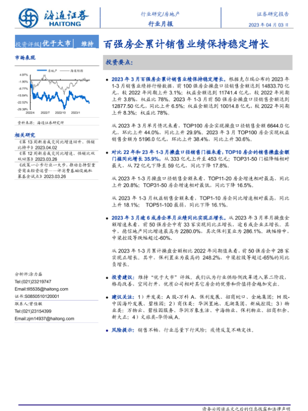 【海通证券】【20230403】房地产行业月报:百强房企累计销售业绩保持稳定增长-10页 行业研究