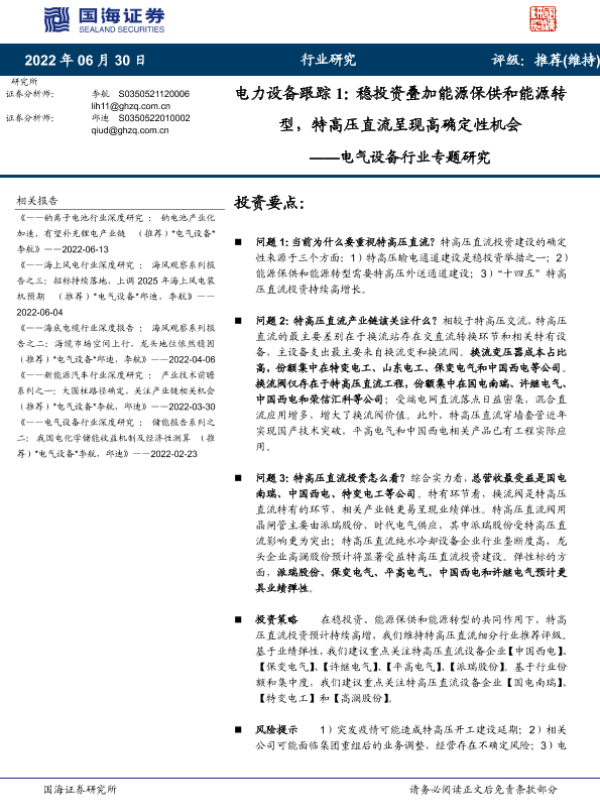 【国海证券】【20220630】电力设备跟踪1:稳投资叠加能源保供和能源转型,特高压直流呈现高确定性机会-16页 行业研究