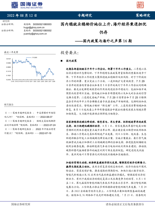 【国海证券】【20220812】国内政策与海外之声第16期:国内稳就业稳物价地位上升,海外经济衰退担忧仍存-21页 行业研究