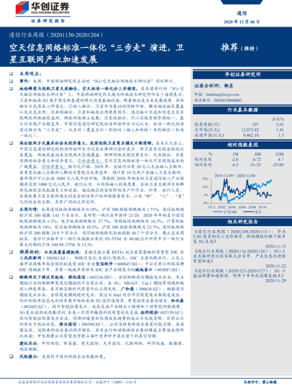 【华创证券】【20201206】通信行业周报:空天信息网络标准一体化“三步走”演进,卫星互联网产业加速发展-22页 行业研究