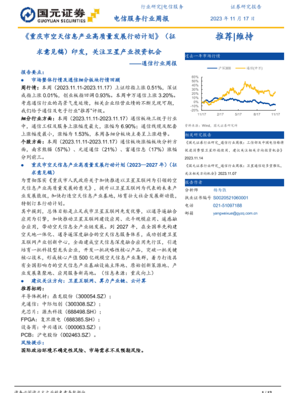 【国元证券】【20231117】20231117-国元证券-通信行业周报:《重庆市空天信息产业高质量发展行动计划》(征求意见稿)印发,关注卫星产业投资机会-12页 行业研究