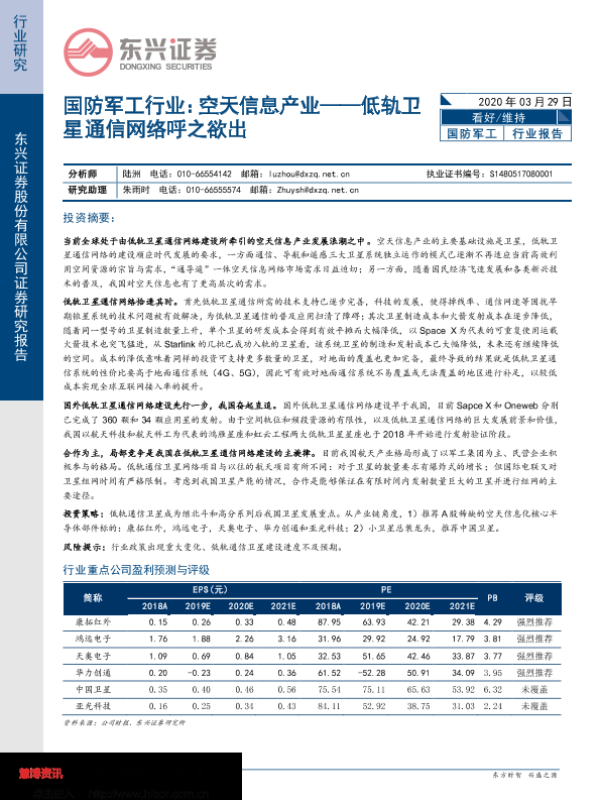 【东兴证券】【20200329】国防军工行业:空天信息产业-低轨卫星通信网络呼之欲出-23页 行业研究