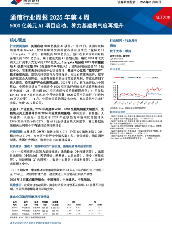 【国信证券】【20250126】通信行业周报2025年第4周:5000亿美元AI项目启动,算力基建景气度再提升-18页 行业研究