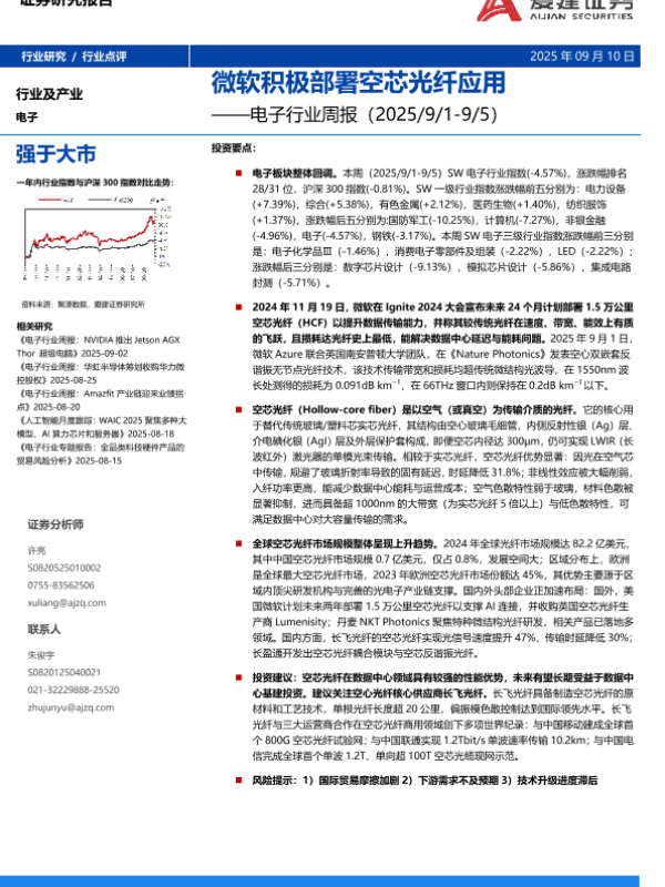【爱建证券】【202509】微软积极部署空芯光纤应用——电子行业周报(2025/9/1-9/5)-16页 证券期货研究报告