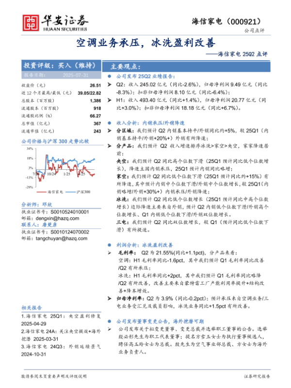 【华安证券】【20250731】海信家电25Q2点评_空调业务承压_冰洗盈利改善-4页 公司研究