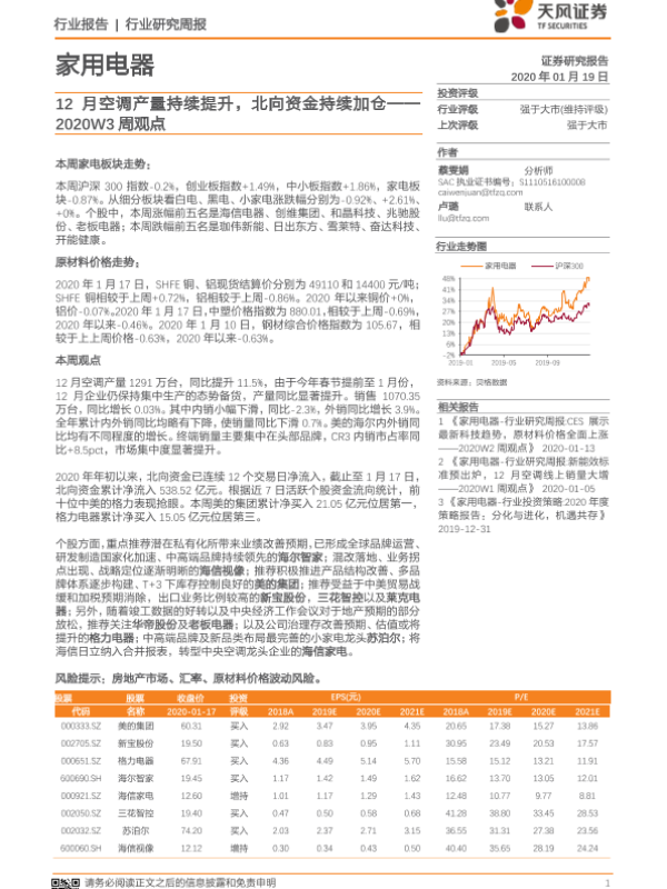 【天风证券】【20200119】家用电器2020W3周观点:12月空调产量持续提升,北向资金持续加仓-12页 行业研究