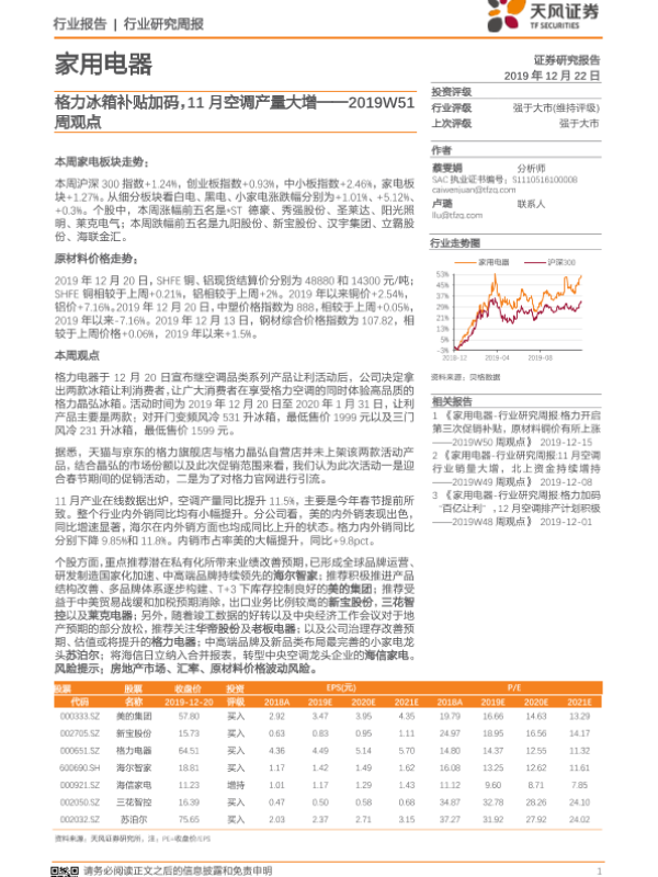 【天风证券】【20191222】家用电器2019W51周观点:格力冰箱补贴加码,11月空调产量大增-13页 行业研究