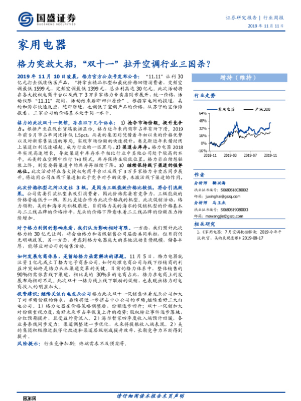 【国盛证券】【20191111】家用电器行业周报:格力突放大招,“双十一”拉开空调行业三国杀?-15页 行业研究