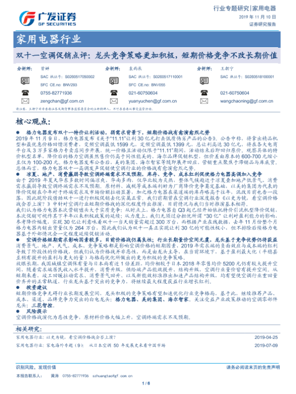 【广发证券】【20191110】20191110-广发证券-家用电器行业专题研究:双十一空调促销点评:龙头竞争策略更加积极,短期价格竞争不改长期价值-6页 行业研究