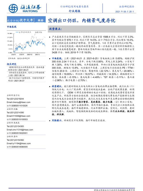 【海通证券】【20210628】家用电器与器具行业周报:空调出口仍旺,内销景气度存忧-5页 行业研究