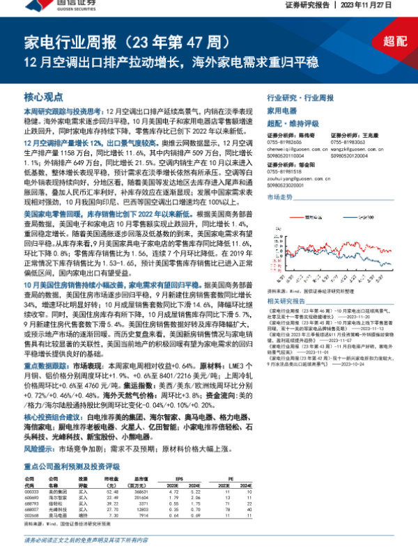 【国信证券】【20231127】家电行业周报(23年第47周):12月空调出口排产拉动增长,海外家电需求重归平稳-14页 行业研究