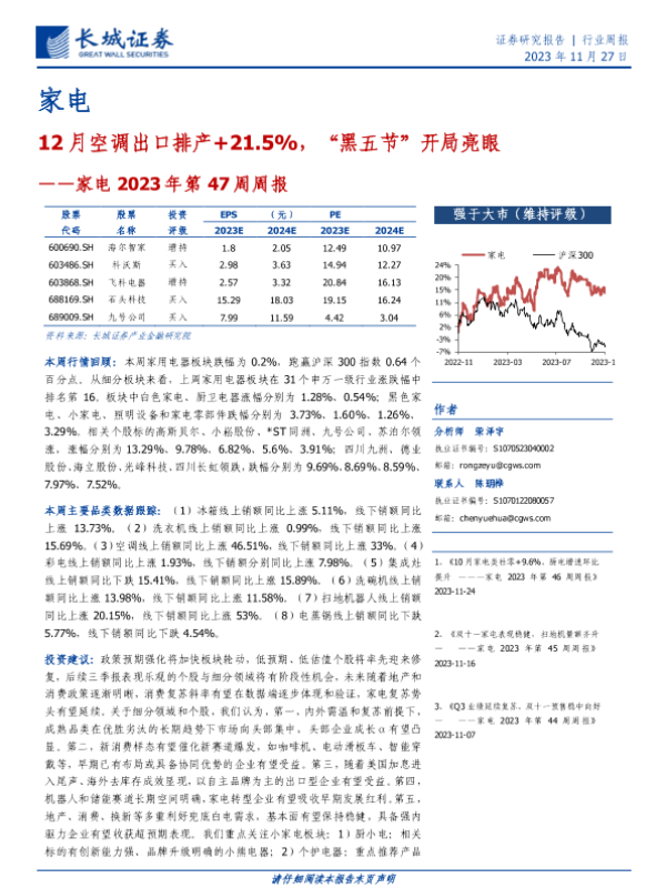 【长城证券】【20231127】家电2023年第47周周报:12月空调出口排产+21.5%,“黑五节”开局亮眼-30页 行业研究