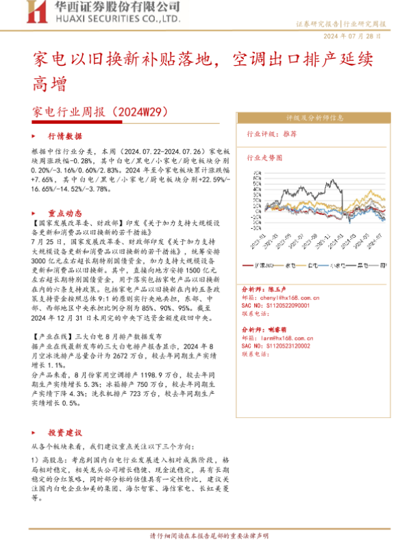 【华西证券】【20240728】家电行业周报(2024W29):家电以旧换新补贴落地,空调出口排产延续高增-12页 行业研究