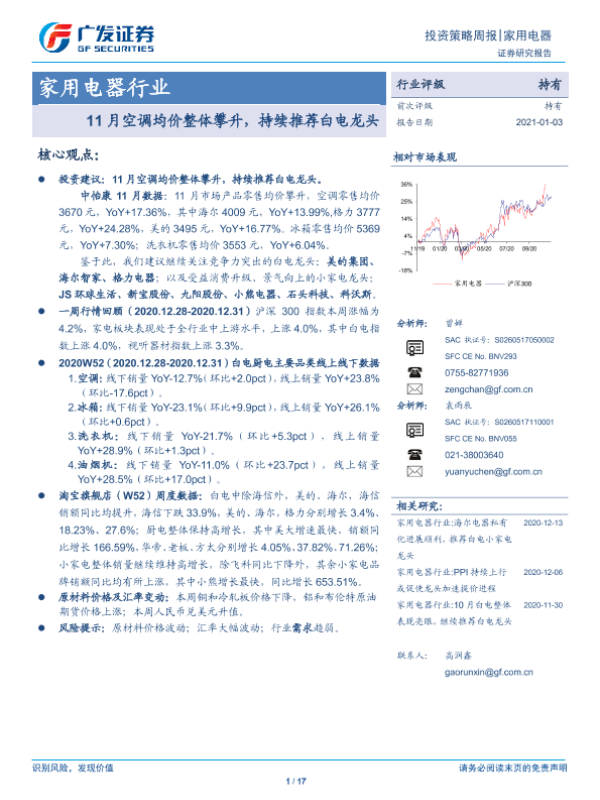 【广发证券】【20210103】20210103-广发证券-家用电器行业投资策略周报:11月空调均价整体攀升,持续推荐白电龙头-17页 行业研究