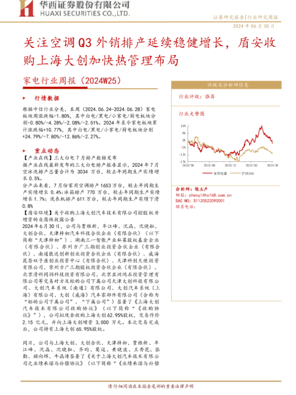 【华西证券】【20240630】家电行业周报(2024W25):关注空调Q3外销排产延续稳健增长,盾安收购上海大创加快热管理布局-12页 行业研究
