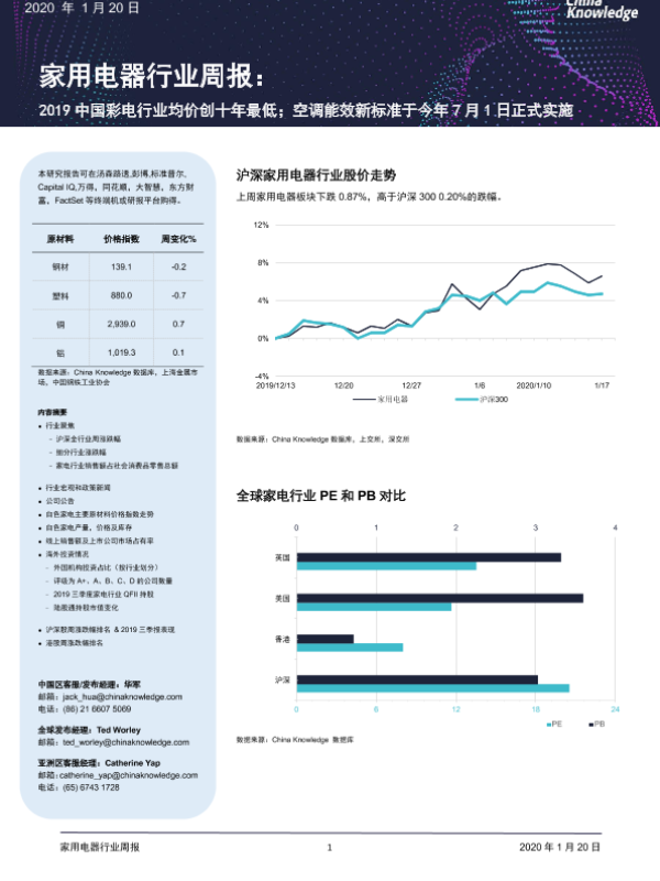 【China Knowledge】【20200120】家用电器行业周报:2019中国彩电行业均价创十年最低;空调能效新标准于今年7月1日正式实施-14页 行业研究