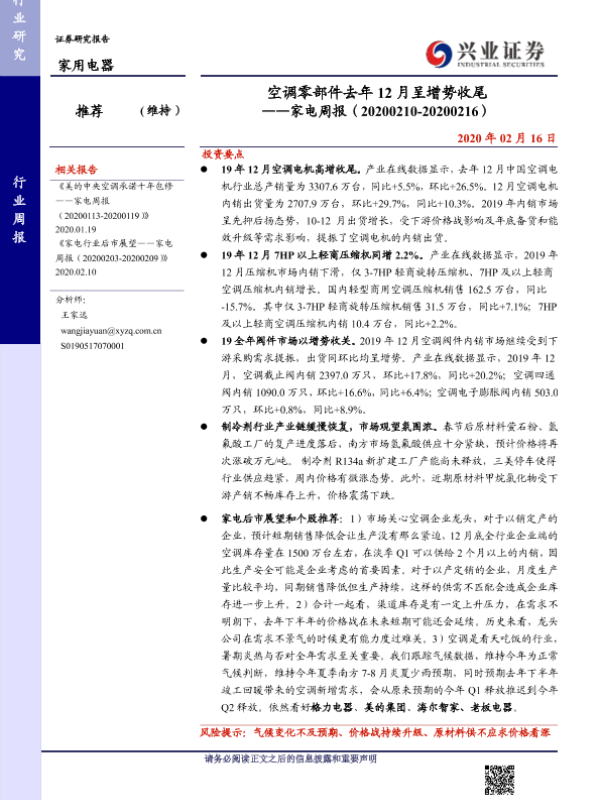 【兴业证券】【20200216】空调零部件去年12月呈增势收尾——家电周报(20200210-20200216)-8页 行业研究