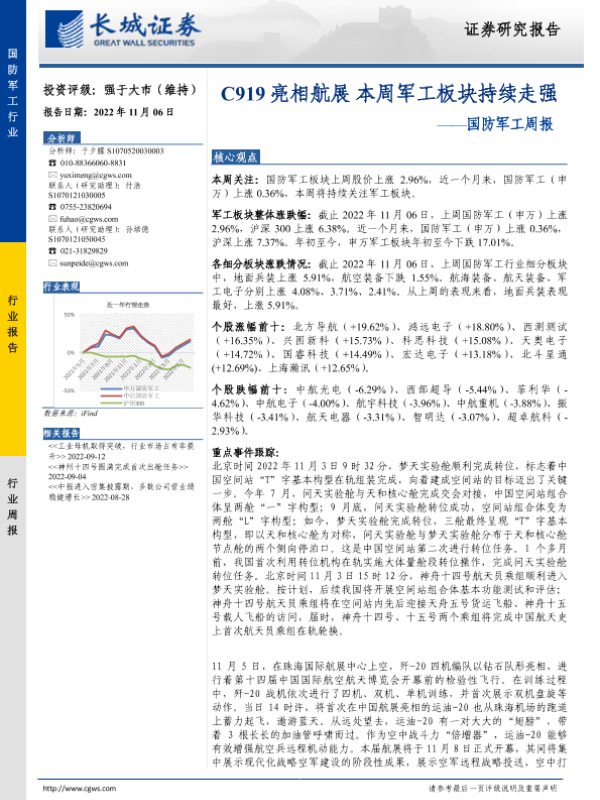 【长城证券】【20221106】20221106-长城证券-国防军工周报:C919亮相航展 本周军工板块持续走强-12页 行业研究