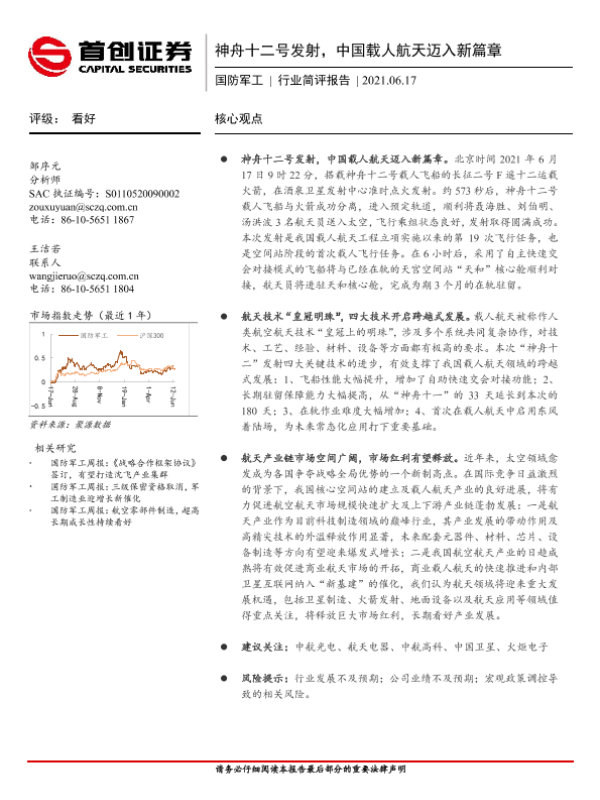 【首创证券】【20210617】神舟十二号发射,中国载人航天迈入新篇章-2页 行业研究