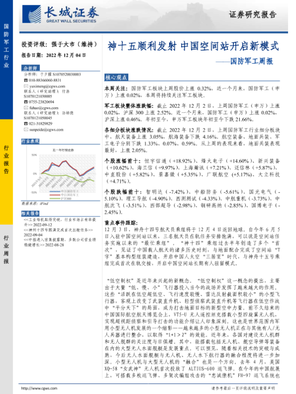 【长城证券】【20221204】20221204-长城证券-国防军工周报:神十五顺利发射 中国空间站开启新模式-14页 行业研究