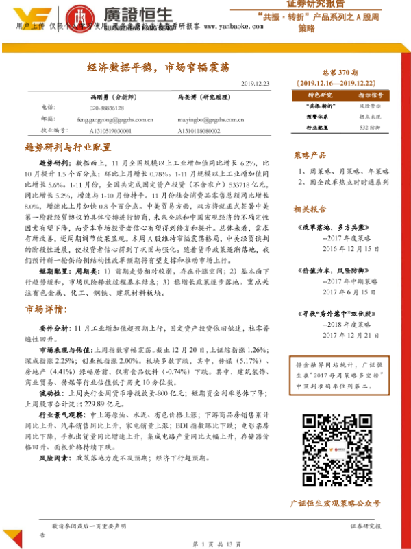【广证恒生】【20191223】“共振·转折”产品系列之A股周策略:经济数据平稳,市场窄幅震荡-13页 证券期货研究报告