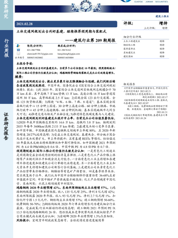 【国泰君安证券】【20210228】立体交通网规划出台利好基建,继续推荐顺周期与装配式-6页 行业研究