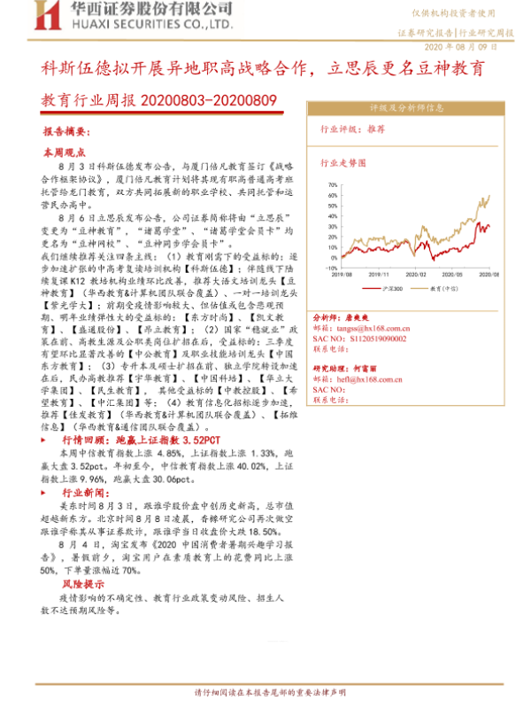 【华西证券】【20200809】20200809-华西证券-教育行业周报:科斯伍德拟开展异地职高战略合作,立思辰更名豆神教育-16页 行业研究
