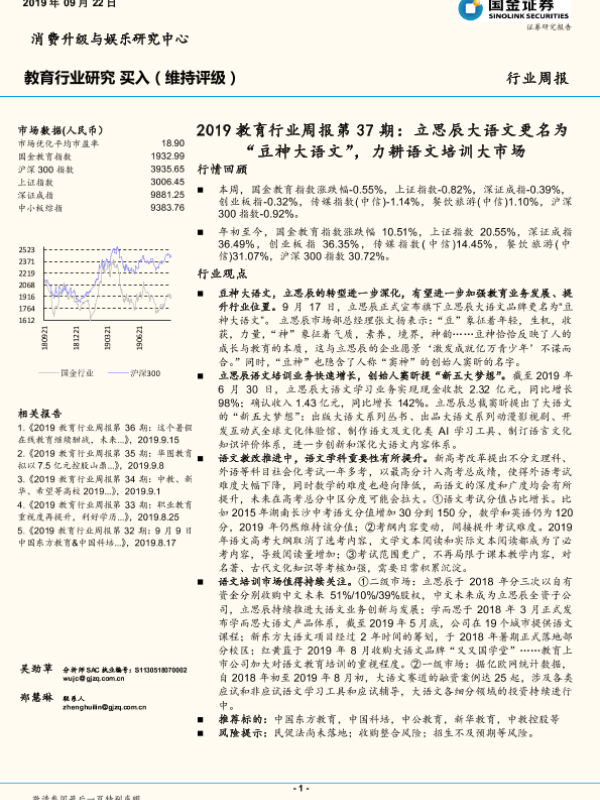 【国金证券】【20190922】2019教育行业周报第37期:立思辰大语文更名为“豆神大语文”,力耕语文培训大市场-7页 行业研究