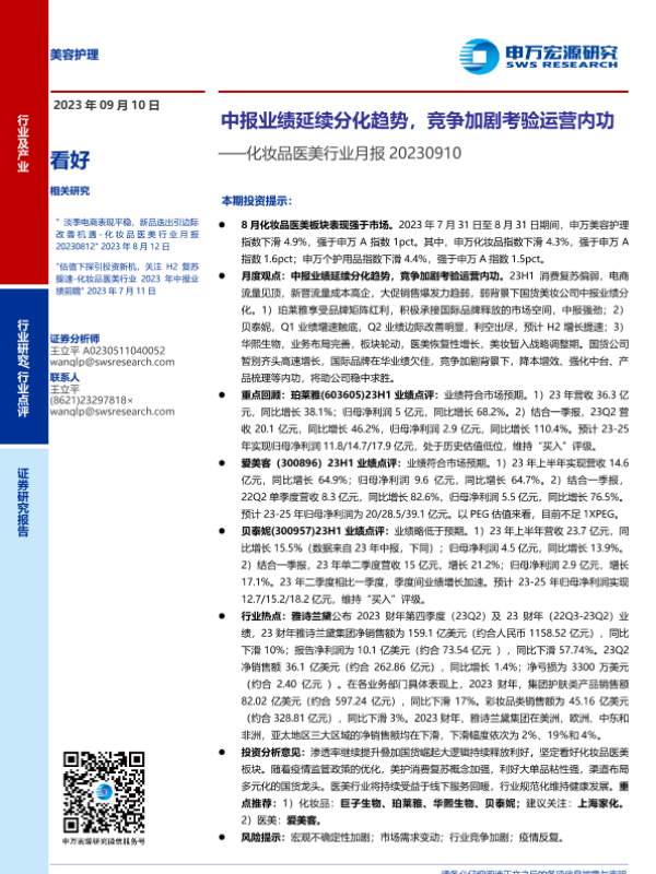 【申万宏源】【20230910】化妆品医美行业月报:中报业绩延续分化趋势,竞争加剧考验运营内功-17页 行业研究