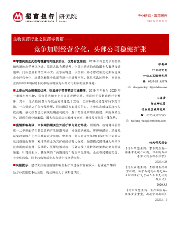 【招商银行】【20200511】生物医药行业之医药零售篇:竞争加剧经营分化,头部公司稳健扩张-18页 行业研究