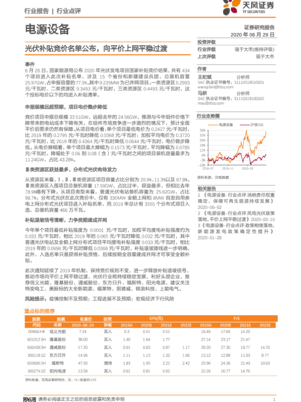 【天风证券】【20200629】光伏补贴竞价名单公布,向平价上网平稳过渡-2页 行业研究