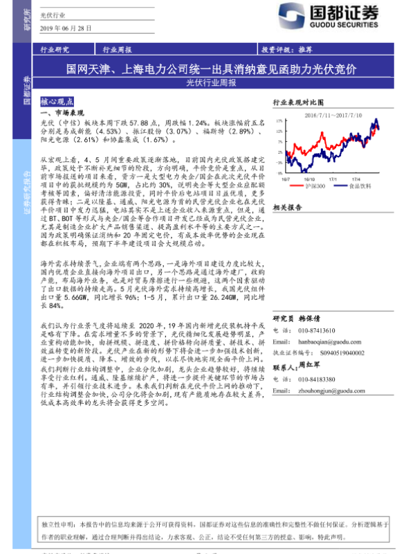 【国都证券】【20190628】光伏行业周报:国网天津、上海电力公司统一出具消纳意见函助力光伏竞价-3页 行业研究