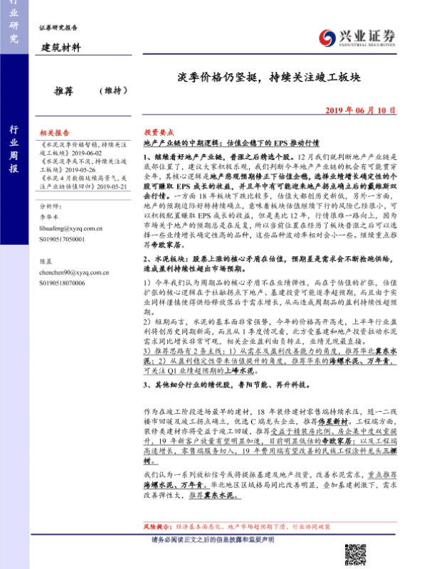 【兴业证券】【20190610】建筑材料行业周报:淡季价格仍坚挺,持续关注竣工板块-16页 行业研究