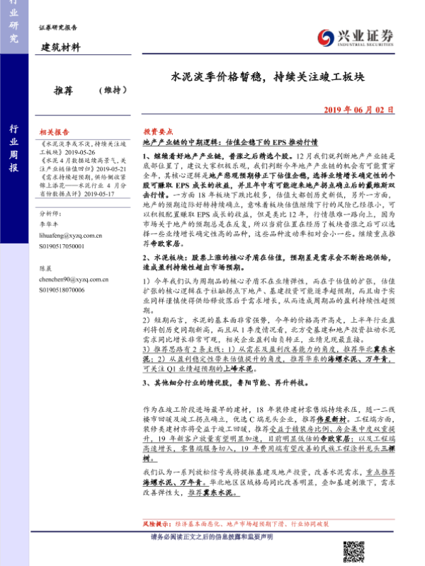 【兴业证券】【20190602】水泥淡季价格暂稳,持续关注竣工板块-16页 行业研究