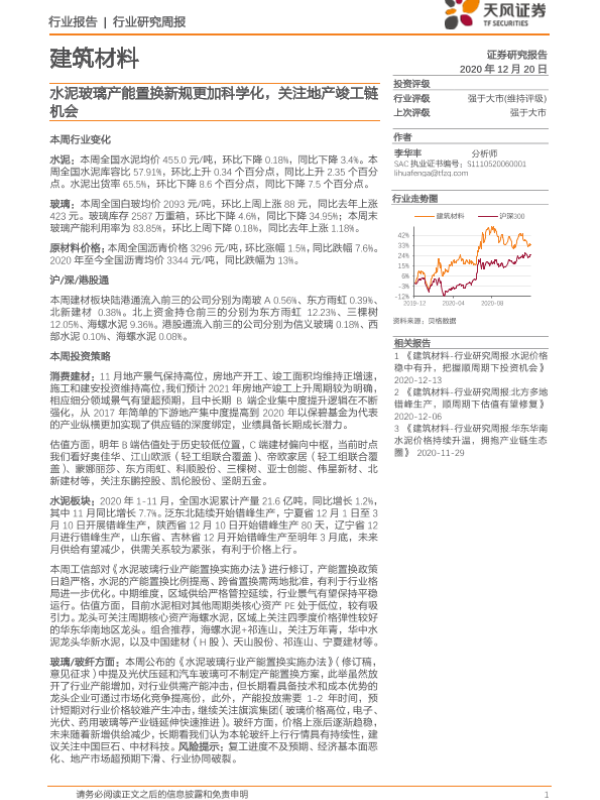 【天风证券】【20201220】建筑材料行业研究周报:水泥玻璃产能置换新规更加科学化,关注地产竣工链机会-15页 行业研究